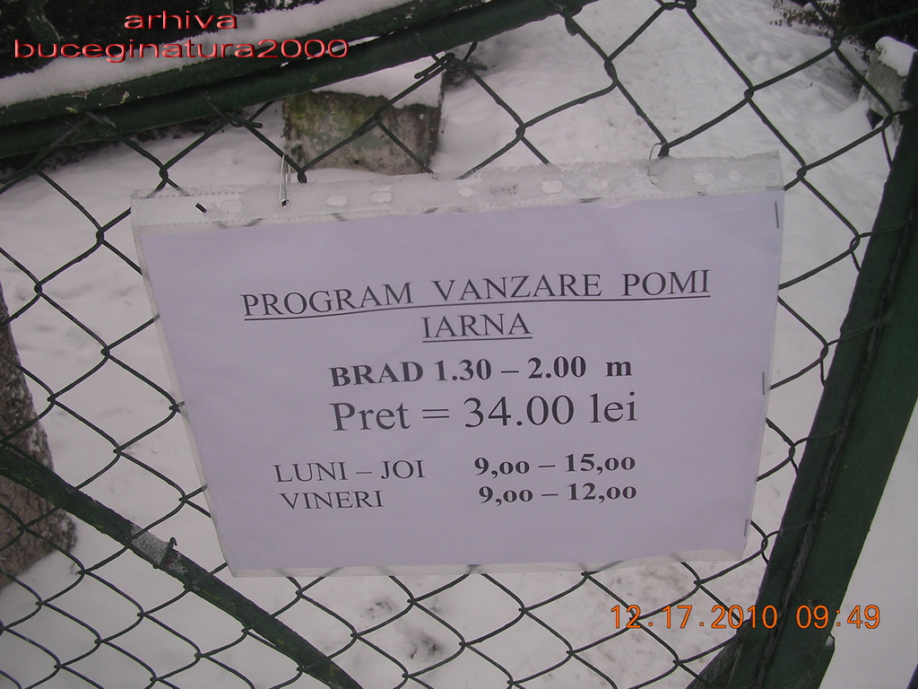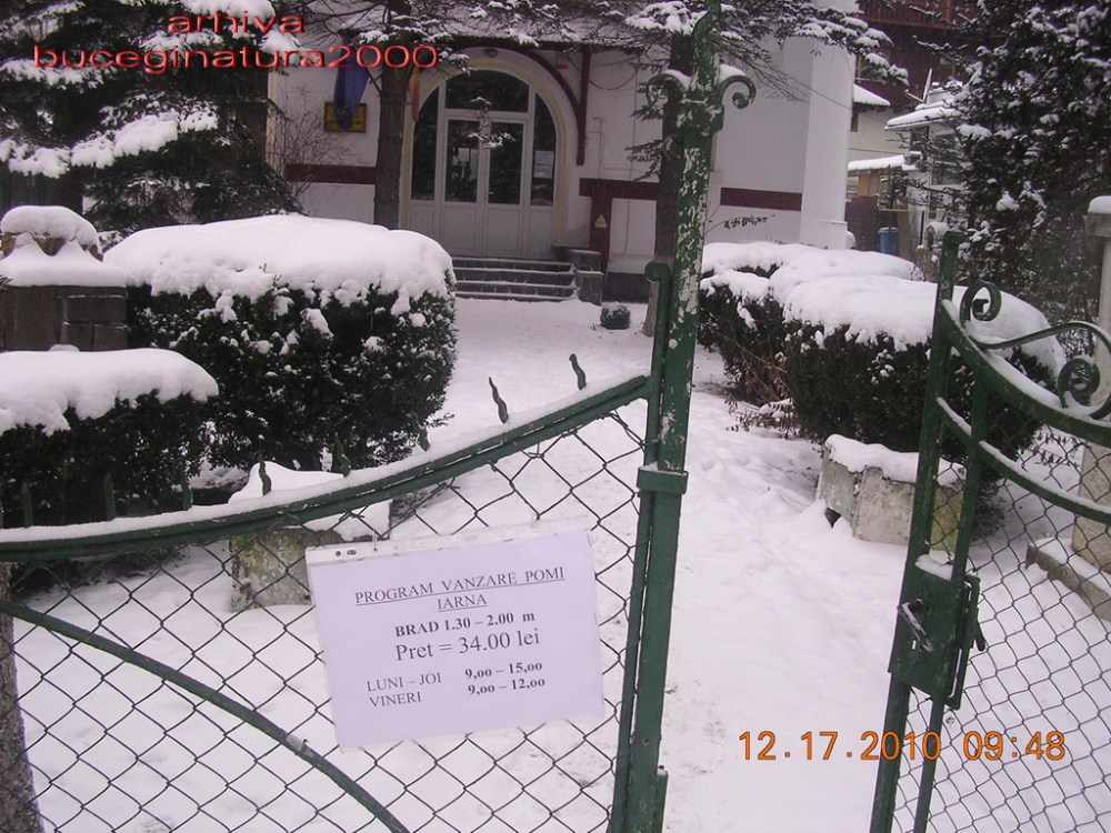 Eveniment Pomi de iarna de vanzare la Ocolul Silvic din Sinaia Publicat de buceginatura2000 on decembrie 17, 2010 Cine doreste sa cumpere un brad se poate duce la Ocolul Silvic din Sinaia, chiar in centrul statiunii, langa Parc. Pe afis scrie brazi. Dar anul trecut pomii de iarna erau molizi. Acum cine cunoaste… Dă clic pentru partajare pe WhatsApp(Se deschide într-o fereastră nouă) WhatsApp Dă clic pentru a trimite o legătură prin email unui prieten(Se deschide într-o fereastră nouă) Email TweetApreciază Încarc... Similare