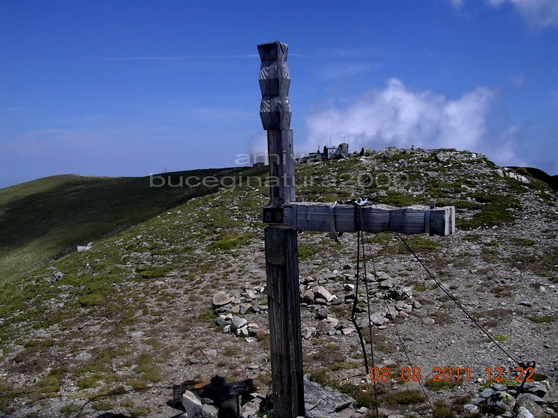 Si am intrat in padure pe la ora 8, iar inainte de ora 10 eram la cabana Babele, un urcus lipsit de probleme. Ne-am deplasat spre Vf. Omu, multa lume pe traseu, inclusiv masini de teren (cred ca o sa devina o problema accesul masinilor de teren prin zona asta interzisa unor astfel de activitati, in contextul asfaltarii lui DJ 713). Am urcat pe Vf. Bucura, vestitul varf Ocolit, sursa nenumaratelor ipoteze, considerat cel mai important punct energetic al planetei…, in apropiere de varf se afla o cruce amplasata pe 8 septembrie 2001, care insa avea un brat rupt, probabil de vant, insa dupa observatiile mele cred ca s-a urcat vreun tampit pe bratul crucii sa faca o poza si a cazut cu lemn cu tot…, stalpul este plesnit mai sus cu jumatate de metru ca o dovada ca a existat o presiune pe acel brat, care era si putred in interior.