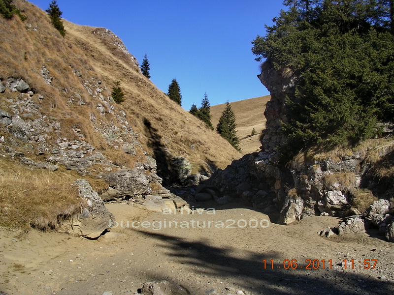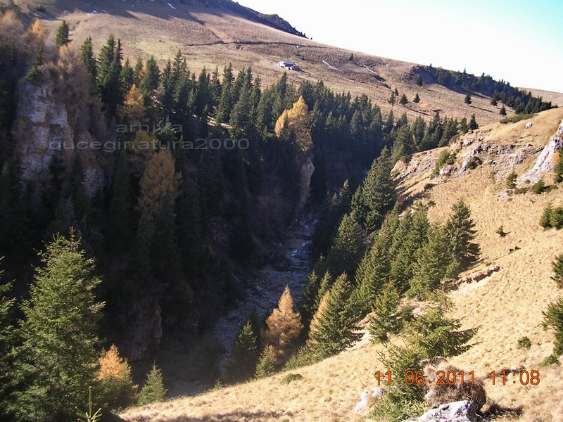 Aici am iesit de sub Colti, in jos este albia paraului Izvorul Dorului, mai in stanga sus, stana din Vanturis. De fapt, Poteca Haiducilor trece peste Varful Vanturis, vizibil tot in stanga. Noul traseu turistic urmareste de aici (locul fotografiei) albia paraului pana la Valea Dorului.