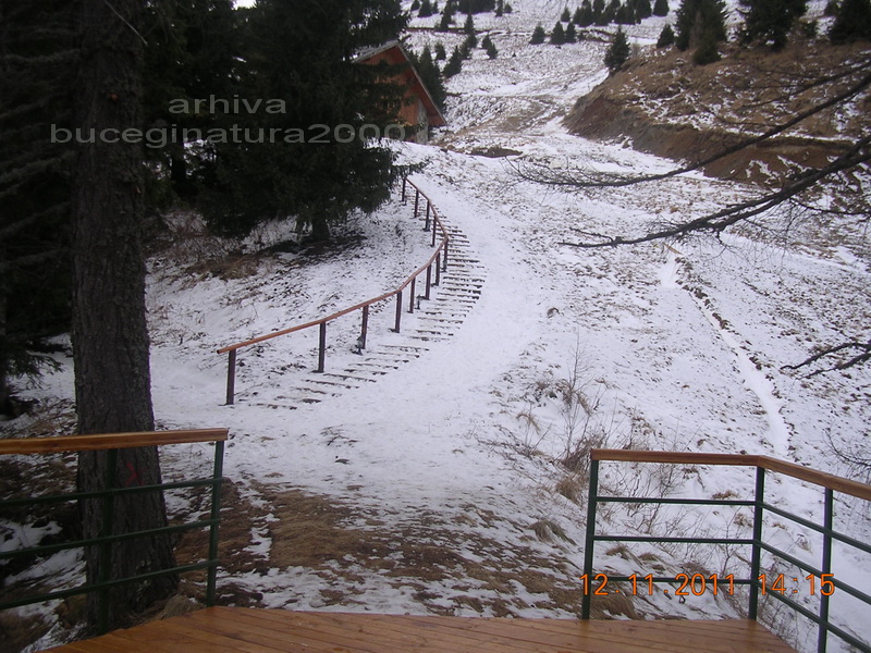 In primul rand cabana era inchisa. E inchisa mai demult, dar n-am stiut noi. Ne-au intampinat un caine legat si unul dezlegat, care s-a imblanzit dupa cateva minute, doar dupa ce l-am lasat sa ma miroasa … :). In difuzoarele de afara se auzea muzica, dar nimeni inauntru, totul incuiat… Probabil ca cel care pazea acolo a iesit la o plimbare…. In fine, nicio problema. Problema e ca, in jurul cabanei era o DUHOARE GROAZNICA ! Am plecat de acolo catre „traseul de iarna”, am ajuns la podetul metalic peste valcelul Zgarbura, am mers vreo suta de metri in directia cota 2000 si mirosul tot persista ! Mi-am amintit ce povestea odata un amic despre cum golea fosa septica un cabanier al unei cabane de pe undeva de prin Apuseni: „ingrasa pamantul padurii”.Tinand cont de miile de turisti care s-au perindat pe la aceasta cabana si tinand cont ca unei vidanje i-ar fi imposibil sa ajunga acolo, oare ar fi totusi posibil sa se „ingrase padurea” si aici, in acest mod ? Ar fi pacat si jalnic ! Adica, dupa ce te chinui sa faci ceva frumos, sa vii si sa dai cu bata in balta si sa faci ceva atat de urat, care anuleaza „de facto” tot ce ai facut frumos ? Dar daca chiar asa s-a intamplat, atunci totul a fost bine calculat: „Inchidem cabana, dam drumu’ la caini, dam drumu’ si la fosa septica pentru pentru ca, asa cum stim, si zeama de varza se arunca doar atunci cand e frig, ploaie sau zapada … Ca sa nu se simta…)