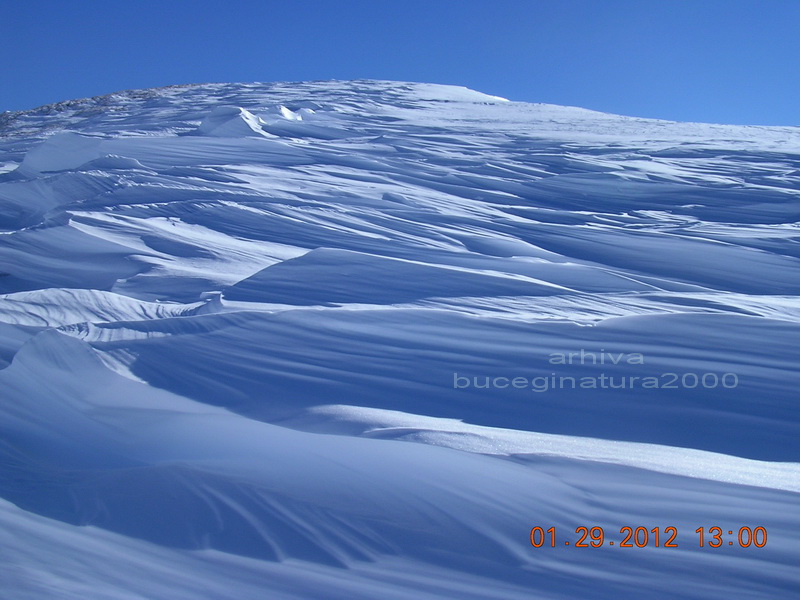 Aproape de Varful cu Dor intinse zone de zapada inghetata modelata de vant