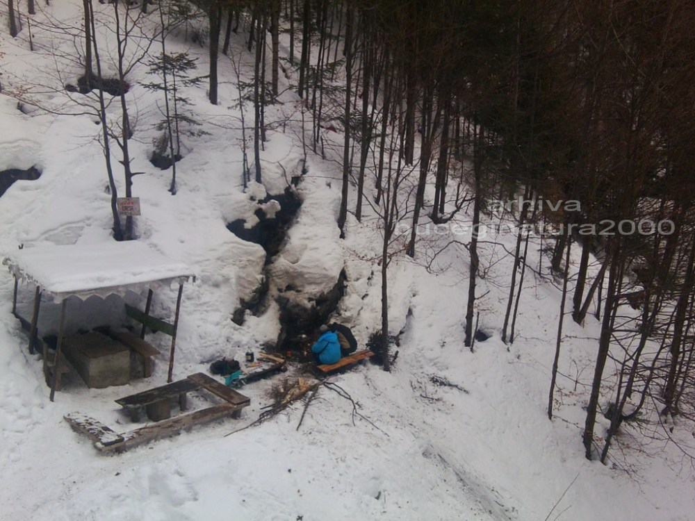Ajungem la cascada, era la fel de invesmantata in gheata. Ne-am suit pe acel bolovan urias din fata cascadei…mare atentie sa nu va urcati, sub zapada este gheata prinsa de stanca…si de acolo am pozat…niste oameni care fac comert de prin 2002 pe la acest obiectiv.