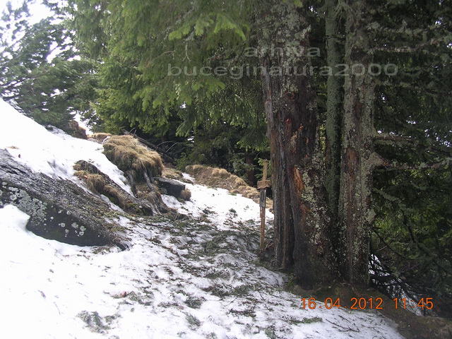 Crucea este langa copac, orice turist ce trece pe acolo, o vede, era si o lumanare…pe care nu am aprins-o pentru ca poate ia foc ceva pe acolo, intr-o padure cu multe uscaturi, licheni, nu umbli cu foc.