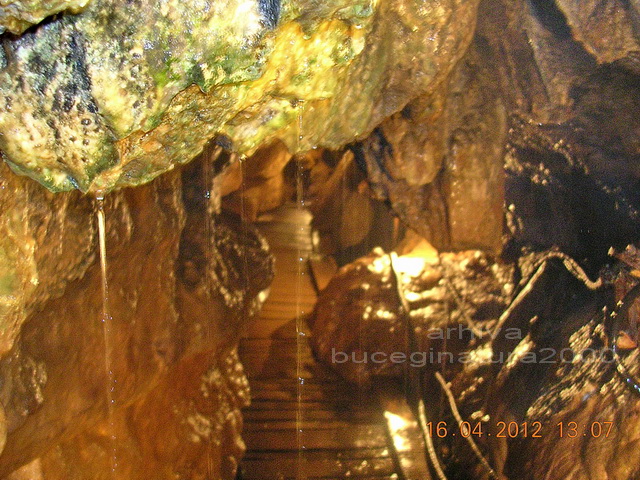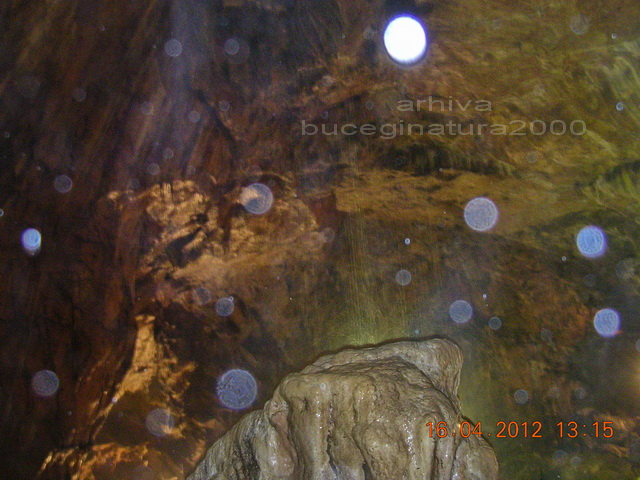 Pe stanca din imagine cadea din tavan un firicel de apa. In bataia luminii picaturile ce sareau alcatuiau un spectacol deosebit…dupa ce au sarit pe aparat am renuntat sa mai fac poze in acest loc…pana la care ajunsesem cu ceva efort, parasind traseul amenajat. Lumina aceea verzuie ar fi trebuit sa fie firicelul de apa…