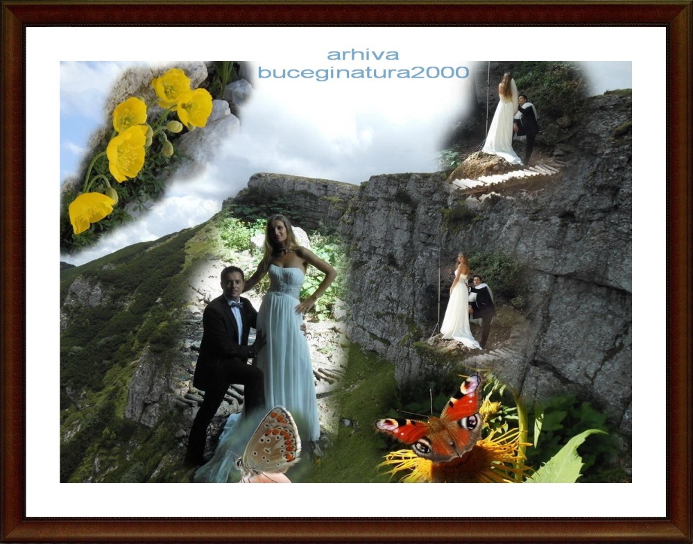 Si acum explicatia tabloului…ca sa vedeti ce imi trece mie prin minte. Deci juramintele lor trebuie sa aiba puterea stancilor din Bucegi, amintirea lor gravata in piatra, de aici cadrul natural ales de mine. Fluturele cu 4 ochi semnifica devenirea celor doi…o singura fiinta, doi ochi ai lui, doi ochi ai ei. Fluturasul cel mic, viitorul copilas. Am pus o poza cu mirii sus pe culmea muntelui, el sa-si aminteasca de faptul  ca si acolo in varf este acelasi lucru: a acceptat sa-si puna inima,sentimentele, in mana ei. Florile galbene sunt maci galbeni de munte. El o tine cu mainile intr-un mod gingas si „mergeau” deasupra lor niste flori asemanatoare…niste flori atat de firave si frumoase incat nu ai crede ca au trecut cu bine prin perioada glaciara. Mirii, la fel, impreuna vor putea trece peste orice piedica ivita in calea lor.