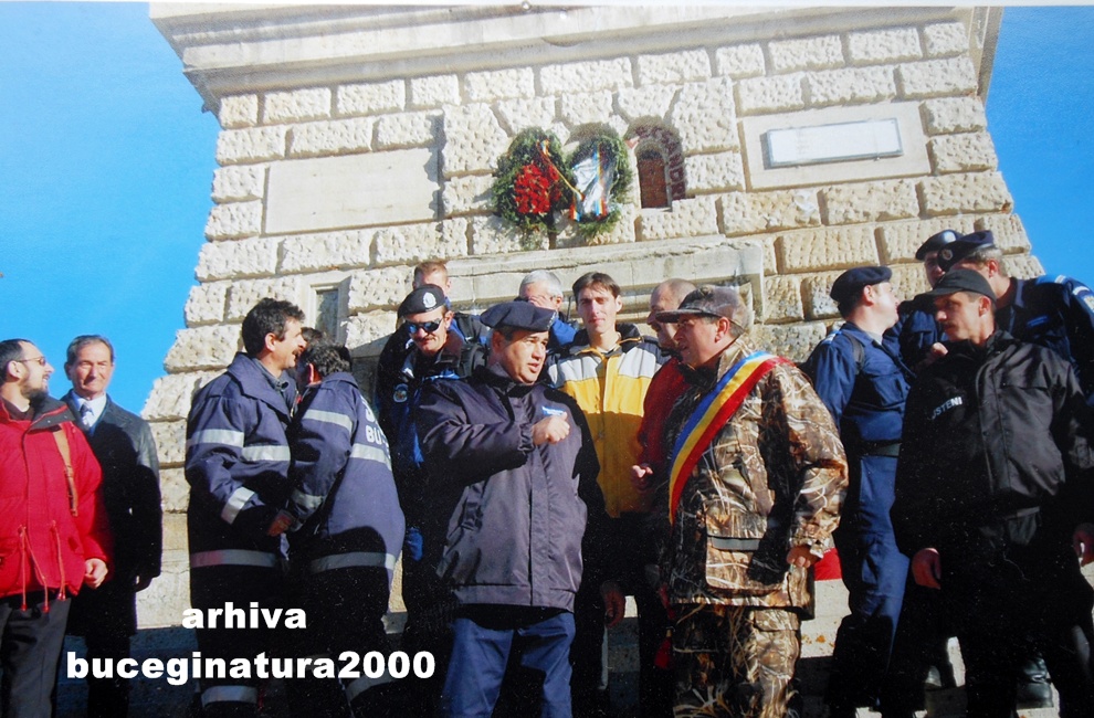 Aici este pe la Crucea de pe Caraiman, intr-o zi de 1 decembrie doua mii si ceva ;) Observati multi jandarmi montani si pe primar costumat militar. Gigel Haiduc, seful salvamont Busteni, aflat in spatele lui, il pacalise că pe 1 decembrie este Haloween-ul :)) De aceea se imbracase asa…de atunci, nu au mai mers la Cruce sa depuna coroane :))