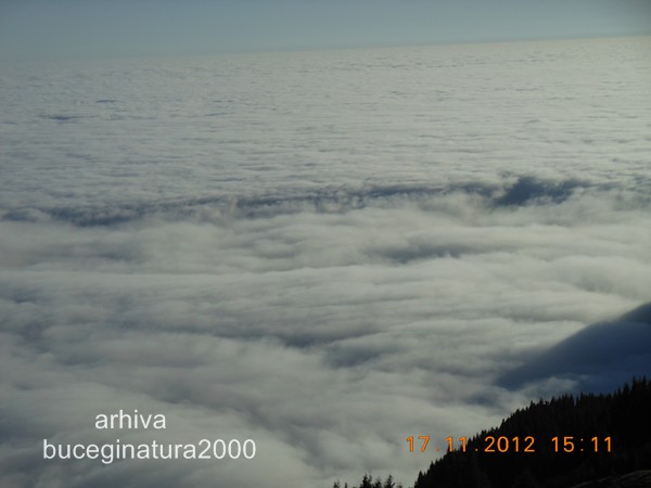 Da, interesant fenomen. Si noi am urmarit acesti nori, dar pe cealalta parte a Bucegilor si am descoperit particularitatea fenomenului. Marea de nori e mai intai un fluviu ce „curge” peste Pasul Giuvala, venind de undeva din culoarul dintre Leaota si Iezer. Se ridica spectaculos peste Fundata si apoi curge spre nordul potcoavei. Asta am vazut noi de pe o vale din Leaota. Norii aveau o traiectorie precisa, chiar ne intrebam ce curent ii tin asa grupati. Fenomenul acesta e de cateva zile prezent la noi, astazi de dimineata am vazut iarasi norii localizati in estul Bucegiului, la altitudine joasa. Groasa masa de nori! La noi e soare :)