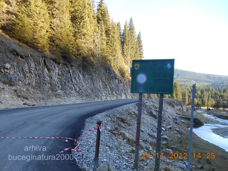 Legat de drumul asfaltat, în ultima imagine văd un panou cu acelaşi semn de circulaţie care se află şi pe panoul de la intersecţia spre Babele. Acest semn înseamnă „circulaţia interzisă în ambele sensuri” şi se amplasează la intrarea pe drumurile publice pe care accesul vehiculelor este interzis. Mă gândesc că o fi rămas de dinainte de asfaltare, sau poate e valabil şi în prezent, dar nu ştiu până când.