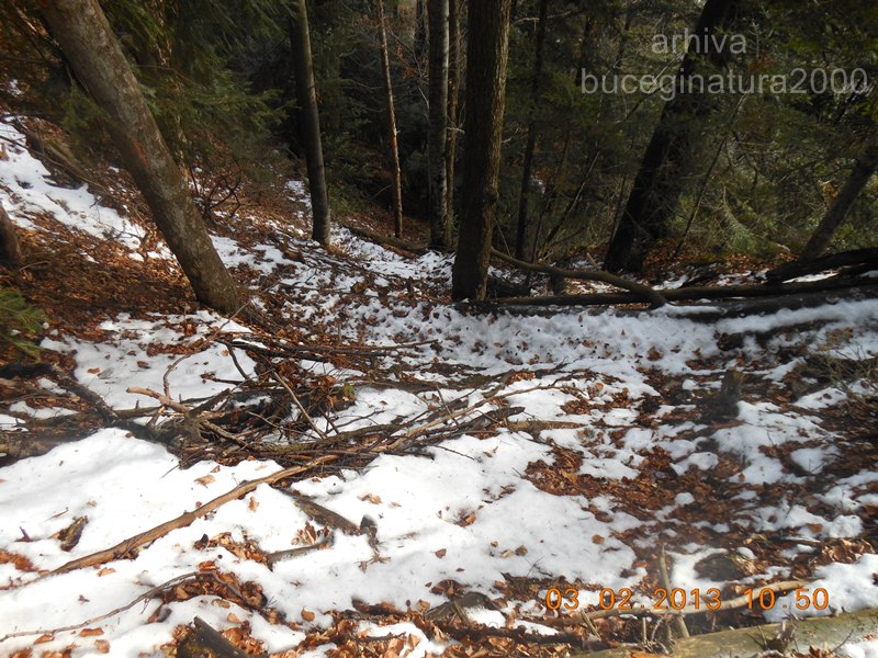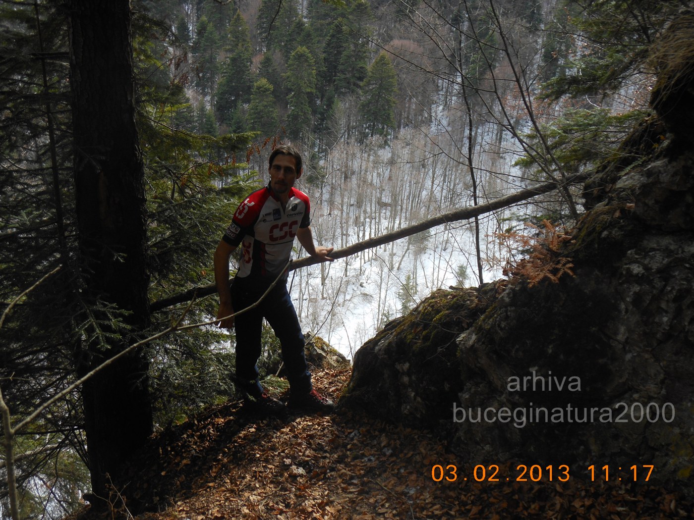 Ne-am dus noi asa, cam in liniste, spre pesterile aflate deasupra unei cariere de piatra, inalta de vreo 200 metri…au si decedat cativa prin aceasta zona. Coboram, aud un zgomot, Matrix aude si el, numai ca scartaitul unui copac, il dubla. Ne-am apropiat de o stanca sa privim spre vale…nu era nimic. Cum zgomotul nu a fost mare, am presupus un animal mic. Asa ca am plecat spre Avenul Haiducilor, atenti la poteca ce mai pastra petice de zapada…insa nu era nicio urma de urs.