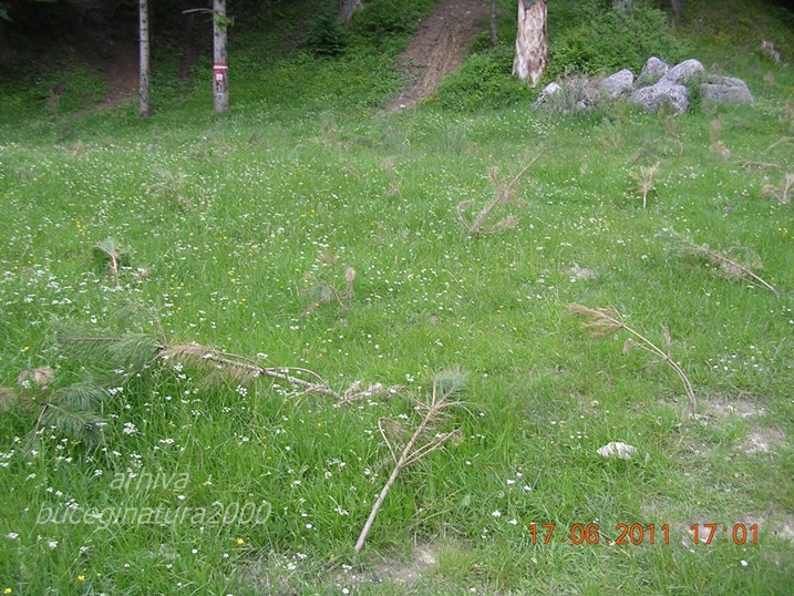 In aceasta zona au fost plantati in anul 2011 circa 2500 pini. Zona se intinde pana mai departe si are o suprafata de circa un hectar. La plantarea televizata au participat oficialitati locale, comisari de mediu, padurari. Puietii au fost pusi la dispozitie de Romsilva. Pentru ca nimanui nu-i pasa, ma refer la cei abilitati, un exploatator de padure, foarte probabil din nestiinta, -cine naiba sa-i spuna cand toti iau diferite atentii de la el-, a distrus, tragand busteni din padure, mare parte din ce era plantat. Ca sa va dati seama de nivelul de incompetenta al oamenilor de mediu cu atributii in Bucegi si Valea Prahovei.
