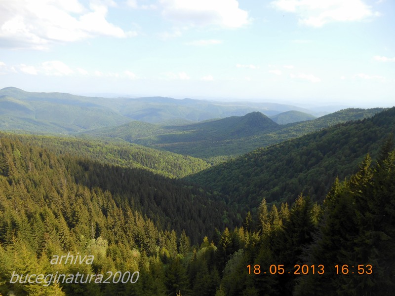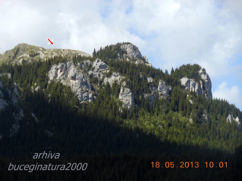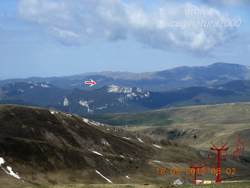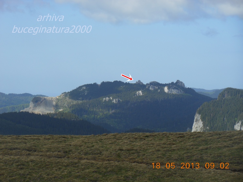 Muntele Lespezi vazut de pe muntele Nucet. Cu sageata rosie, monumentul natural Claia de Piatra