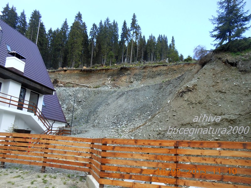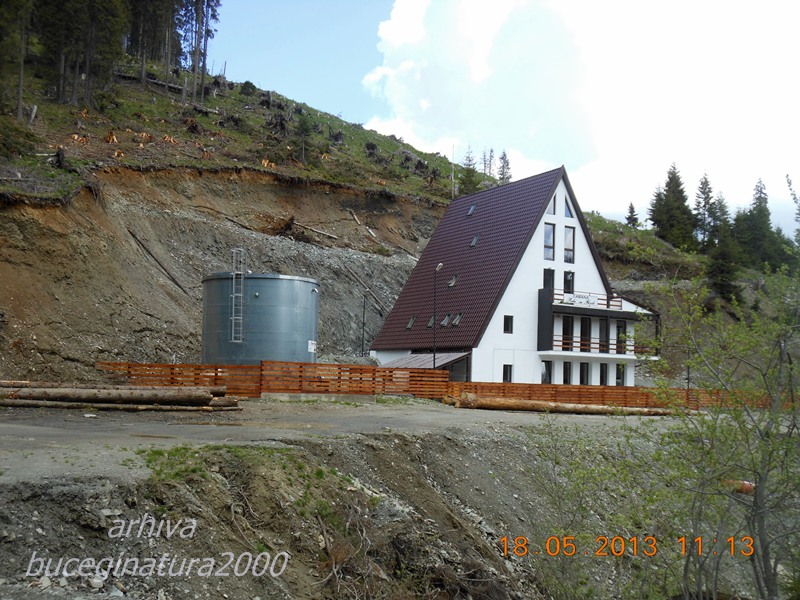 Cabana in 2012. In spatele ei, padurea. Tot surpandu-se terenul pe langa aceasta „investitie in turism”, unii au crezut ca de vina este padurea :)) Venisera niste fonduri suplimentare de la Ministerul Dezvoltarii in 2011 sau 2012 pentru stabilizarea versantului. In teren, banii nu au ajuns niciodata :) Asa ca, priviti ce au facut: