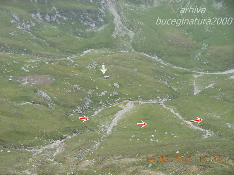 In stanga cum urcam, vedem jos: cu galben, mica stana din caldarea superioara a Vaii Gaura, cu sageti rosii traseul turistic spre Bran, marcaj cruce rosie