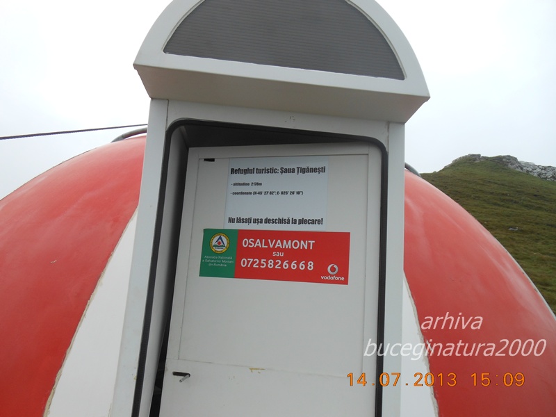 Refugiul din Saua Tiganesti, singura amenajare turistica din aceasta parte a Bucegilor. Tineti cont ca de la cabana Omu si pana aici sunt cam 2 ore, deci daca ploua puternic, -pe munte nu prea ploua usor :) -, nu este prea grozav sa fii pe creste…intre cele doua locatii.