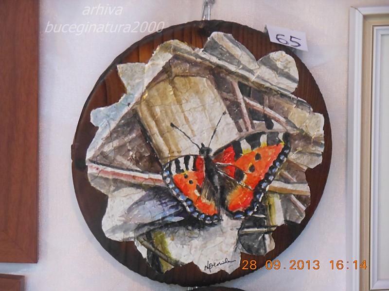 Un superb fluturas, Aglais urticae sau fluturele urzicii :) Confundat de unii in natura cu un fluture rar -Nymphalis vaualbum. Diferentele constau atat in marime cat si in colorit. Ultimul nu are dantela albastra si etc…Am si eu pe acasa de anul trecut, cateva picturi pe coji de oua.