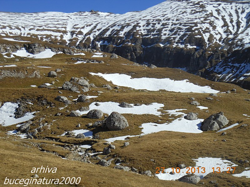 Vedeti cum se coboara de la Omu pe traseele spre Bran…sa va fac o scurta descriere. Am ales traseul spre Bran prin Valea Gaura, pentru ca acum este perioada cea mai buna, din multe puncte de vedere…ceea ce explica si lejeritatea mea. Deci, vremea nu se schimba atat de repede toamna, turmele de animale sunt coborate, astfel ca nu ai probleme cu cainii, ciobanii sau cu animalele salbatice ce stau prin apropierea stanelor. Toamna este lunga, bogata in jir, si ursii au coborat altitudinal, in padurile de fag. Zapada nu avea cum sa se pastreze pe terasele glaciare si pantele expuse din aceasta vale…asadar din start nu te mai gandesti la unele lucruri, si doar te plimbi!