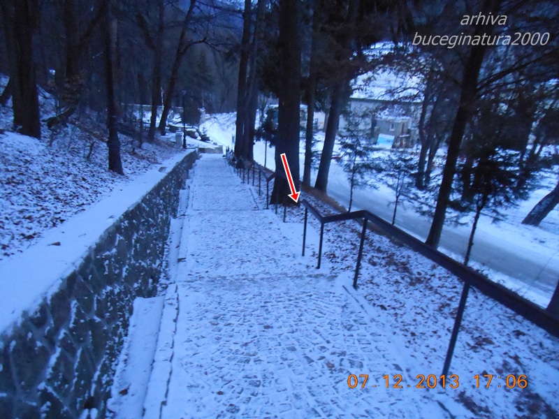 Aceasta este aleea cu trepte. Mai jos se vad sensul giratoriu si Cimitirul Eroilor. Pe cand urcam ieri, am constatat ca nu mai este banca de pe marginea acestei alei. Era in locul unde am pus sagetile rosii. De ce or fi luat acea banca? Este foarte frumos sa stai pe ea, seara de exemplu…