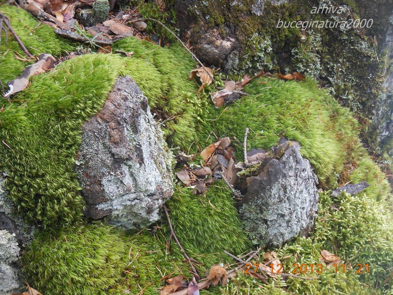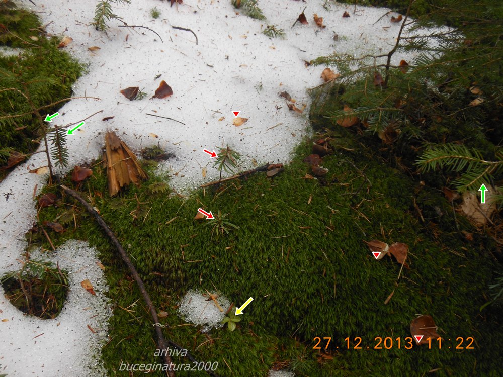 O poveste intr-o poza. V-ati gandit la asta? Cu sageata galbena-o frunza de frag, triunghiurile rosii arata cojile unui con de brad desfacut de o veverita, triunghiul rosu de pe zapada semnalizeaza o samanta de brad. Sagetile verzi indica puieti mici de molid, iar cele rosii, de brad. Pe acest covor de muschi, permanent umed, se vor naste alti puieti…