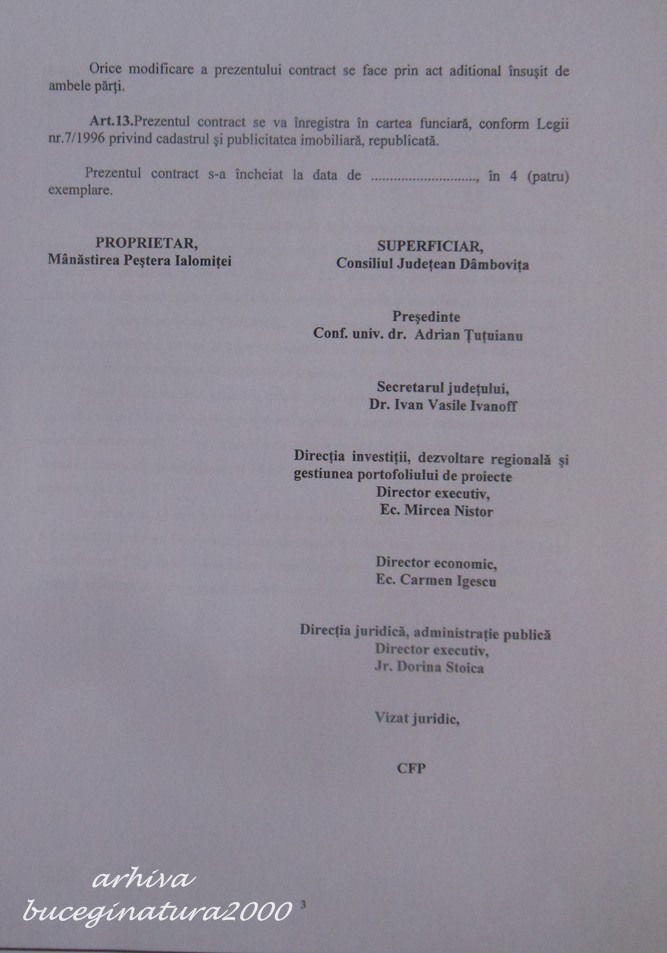 Ma intereseaza in mod special proiectul de reabilitare, de dezvoltare a turismului, pe care Consiliul Judetean Dambovita il aplica la Pestera Ialomitei. Periodic, voi fi pe acolo si voi scrie pe aici ce se intampla. Iata forma unui contract ce va fi incheiat intre CJ Dambovita si reprezentantii manastirii: