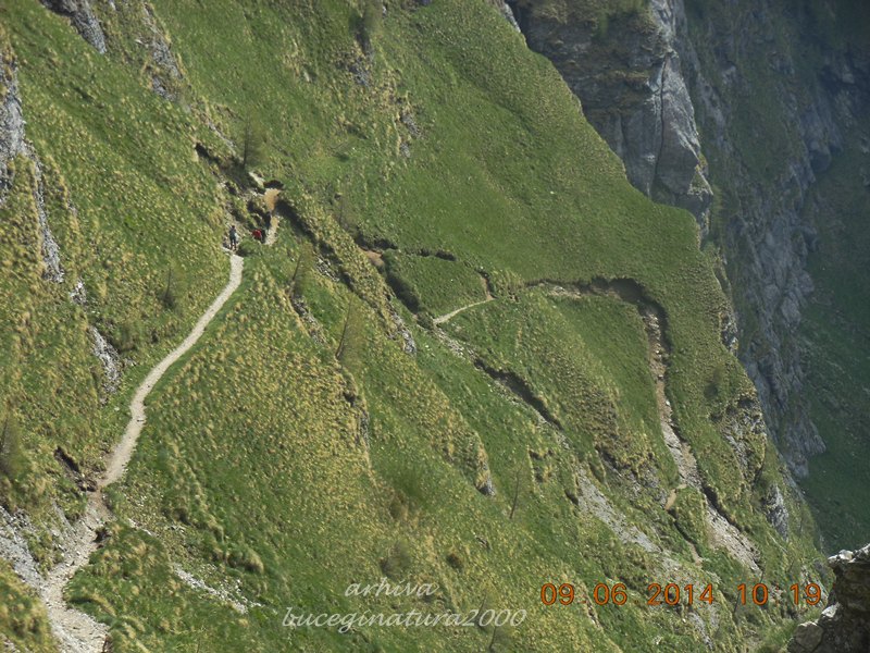 Aproape de Cerdac, la intersectia de poteci… daca ai bocanci se poate merge si pe poteca de vara, daca nu, este bine si pe deasupra Cerdacului, dupa cum arata sageata alba… in stanga