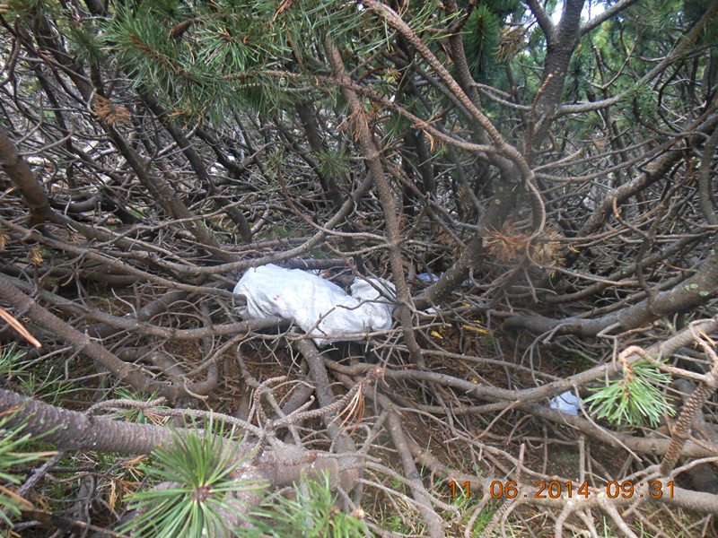 Un sac plin de gunoaie, aruncat de la o stana din apropiere, printre jnepeni