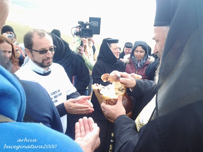 A vorbit si primarul, a spus niste cuvinte frumoase… dupa care, pe o masa, erau niste cozonaci mari. Arhiepiscopul a inceput sa rupa din ei si sa imparta la cei prezenti. O bucata mare i-a fost data primarului, sa imparta si el. Bineinteles ca eu cu pozele mele ajunsesem langa primar, asa ca o parte din cozonacul lui a ajuns la mine. Ce face si „intamplarea” asta :)