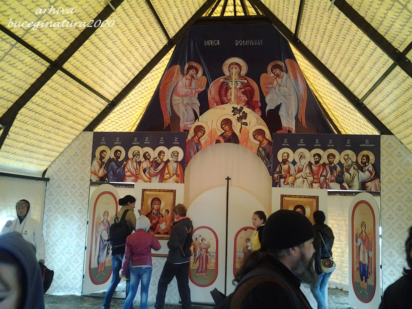 Bun, si se termina evenimentul, eu intru in bisericuta din plastic si lemn, ce va fi demontata in zilele urmatoare, mai stau putin si plec spre… vf. Omu. Aveam de gand sa ajung pe muntele Obarsia… desi era ceata pe acel munte, tot am plecat intr-acolo. Merg ce merg si vad in dreapta, mergand pe pajiste, doi preoti: erau staretul David de la manastirea Caraiman si arhiepiscopul. Bine, eu ulterior am aflat cine era, intrebandu-l pe parintele staret David.