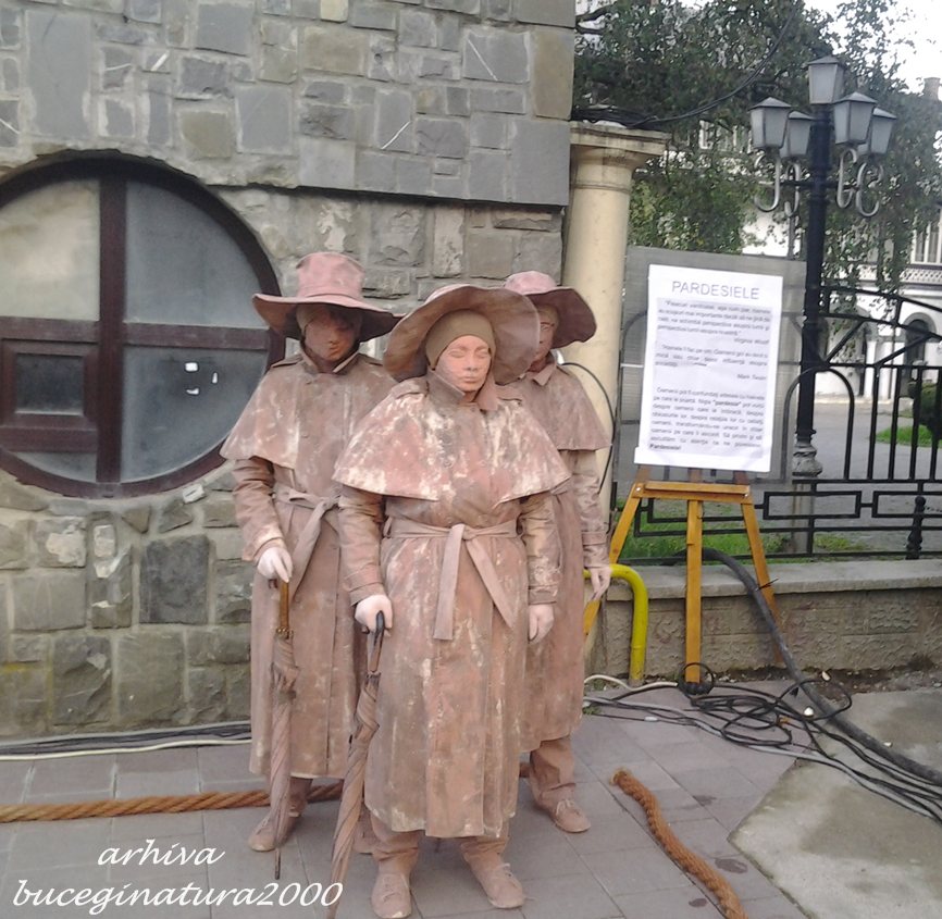 Cele 3 statui din mijloc erau artisti de la teatrul Masca… vii, evident! :)