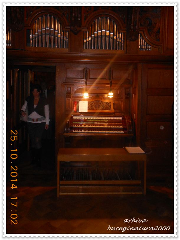 „Orga a fost construită în anul 1904 de firma Rieger (Jägerndorf) şi era unul dintre instrumentele preferate ale reginei Elisabeta, aceasta primind, la vârsta de 12 ani, lecţii de la organistul, pianistul şi compozitorul Sigismund Neukomm, când acesta se afla ca oaspete în castelul Monrepos de la Neuwied (Germania).
