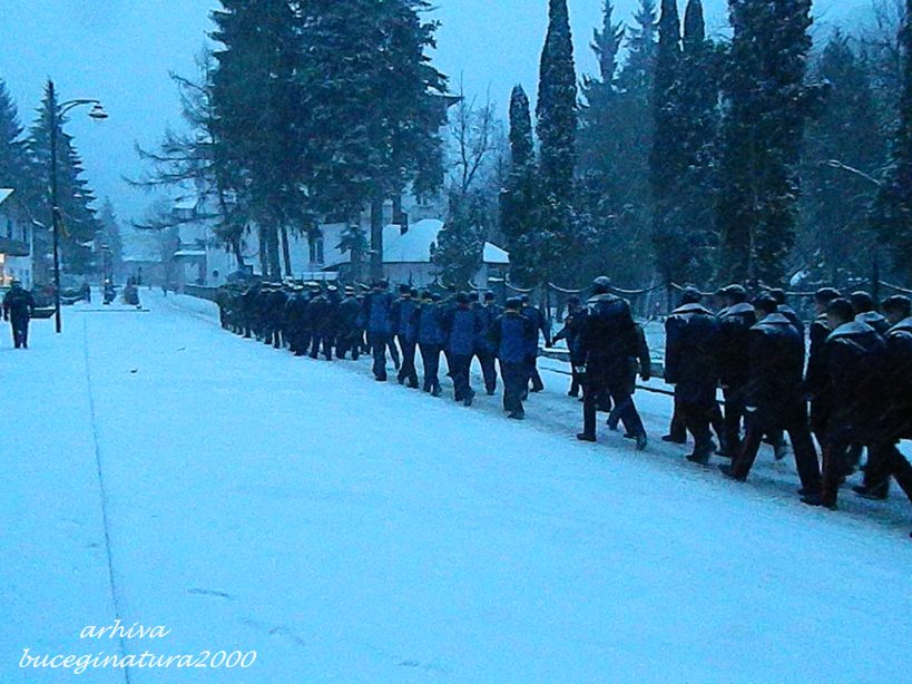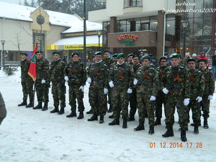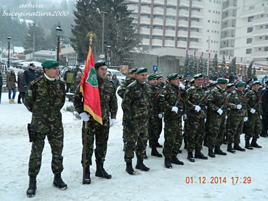 Aici se pot vedea toate formatiile ce au defilat la Sinaia: elevii liceului militar, instructorii montani ai Jandarmeriei, cei de la ISU si cei de la vanatori de munte… Un moment interesant a fost la Cimitirul Eroilor, unde un ofiter (probabil!) care-i conducea pe elevii de la liceul militar i-a zapacit putin pe acestia sub ochii spectatorilor. I-a intors cand la stanga, cand la dreapta, le-a dat cu pasi inainte si nu stiu cati in lateral, iar i-a intors si i-a tot sucit… sa creeze el impresie, sa ne arate noua cine este el! :) :)