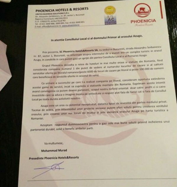 Dragi Azugeni , sper din suflet ca astazi 15 Decembrie ,va fi ziua in care Orașul nostru va Renaște din Temeli. Acum as dori sa va explic despre ce este vorba : dupa cca 7 luni de discuți de explicați de argumente pro si contra , am reușit sa conving pe cel mai mare operator turistic din Romania , respectiv PHOENICIA GRUP sa investească in Azuga si nu oriunde ci in Golul Alpin acolo unde acum pasc oile dar in același timp tot acolo priveliștea este UNICA. Investiția este ffff mare cca 3000 de locuri de cazare deci o stațiune in toată regula . Asta înseamnă pentru orașul nostru cca 350-400 locuri de munca si cca 5 milioane euro impozite si taxe . Adică de trei ori bugetul actual al orașului. .pentru ca precis vor fi si citiva Circotasi cărora nu le convine nimic , voi posta Scrisoarea de Intenție trimisa astazi de Phoenicia Grup“. Preluare de pe http://www.max-media.ro/afaceristul-care-a-facut-o-lata-in-ploiesti-promite-3000-locuri-de-cazare-la-azuga.html
