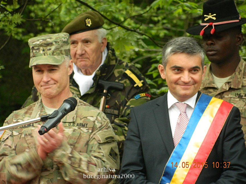 Primarul din Sinaia, dl. Vlad Oprea incadrat de doi generali, la dreapta sa unul american iar la stanga, unul roman