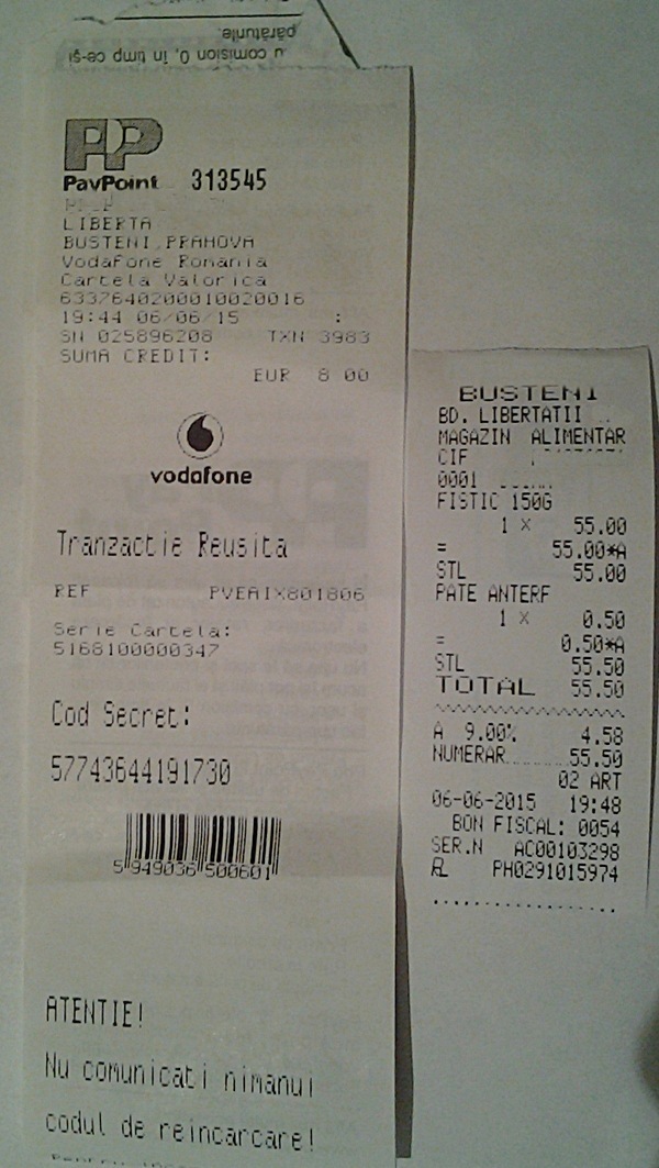 Dau banii, 55 lei cartela si 50 de bani pachetul cu servetele. Iau bonul si ma uit pe el, apoi la vanzatoarea care misca din umeri… si plec. Nu stiu daca sa rad sau sa zic ceva. Mi se pare ceva extraordinar ce vad scris pe bon.