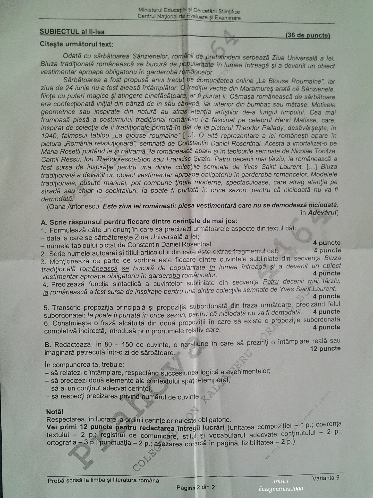 :) Asa la prima vedere? :) Cred ca luati mai mult…sunt elevi care au facut totul intr-o ora :) Eu m-am mai uitat pe variantele acestea si aceasta mi s-a parut cea mai simpla. La Romana, ar trebui sa fie un procentaj mare de promovabilitate.