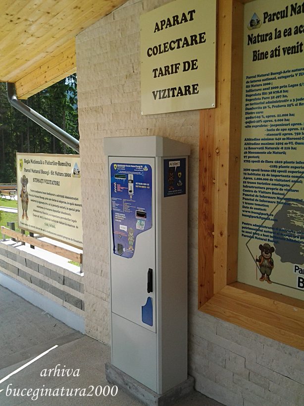 Ca sa intri in Parcul Natural Bucegi trebuie platita o taxa la acest aparat… deci nu este o taxa pentru a se intra in cladirea Centrului, cum am fost intrebat. Trebuie citit putin pe panourile din preajma acestui aparat.