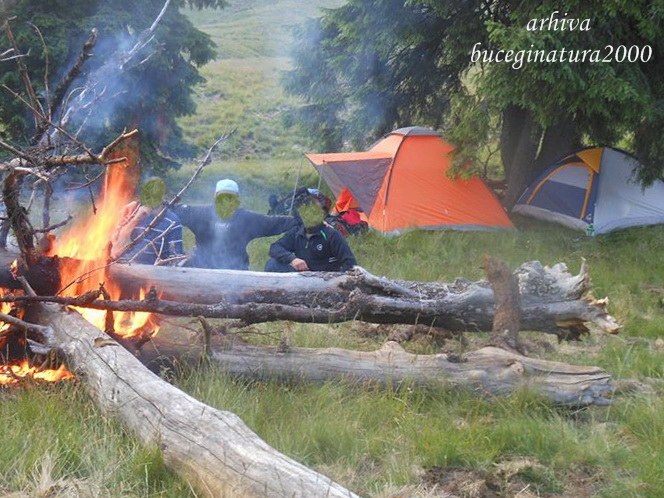 Am pus corturile cam pe la 1750 metri altitudine, pe un teren plat, intins, presarat cu arbori din specia molid, un peisaj asemenea unui parc amenajat prin oras. Te plimbai prin iarba, printre copaci, izvorul era aproape… in multe locuri molizi uscati de ani de zile si cazuti. Nu a trebuit decat sa ne punem mintea si puterile noi, baietii, cu niste trunchiuri si gata focul si stocul de lemne.