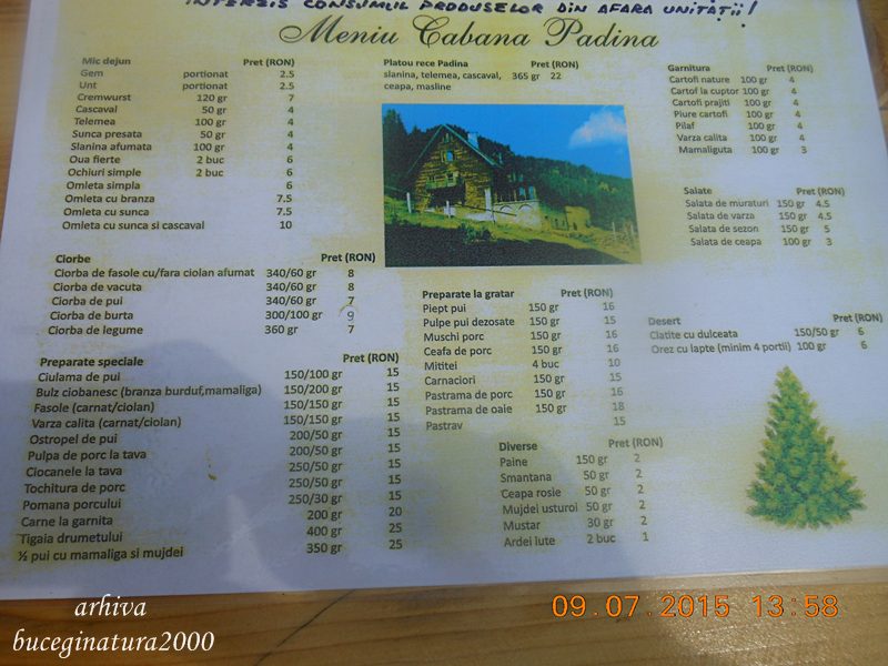 Ne-am oprit la cabana Padina sa ne strangem cu totii dar sa si mancam. Am luat diverse de pe acolo. Iata si meniul lor: