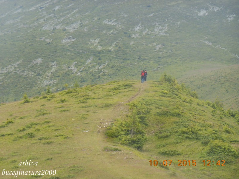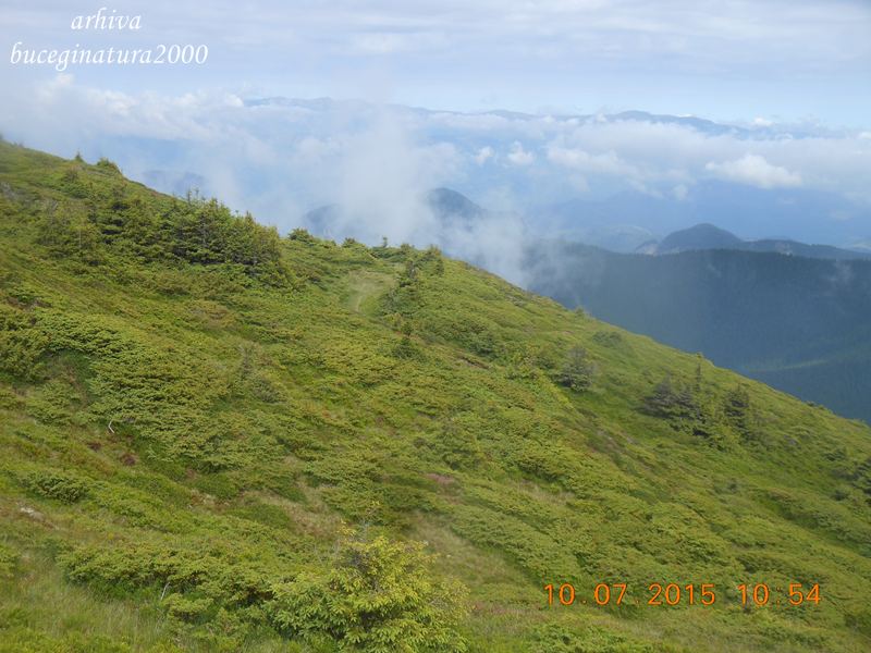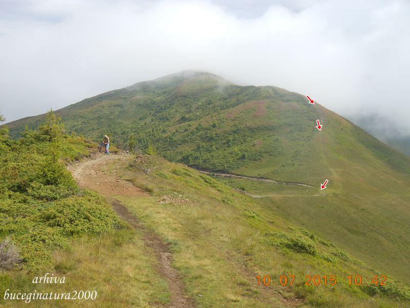 10.07.2015 065De pe o muchie din dreapta, venea un traseu marcat cu punct albastru ce se oprea la varf. Bine, este impropriu spus traseu, ca nu era nicio poteca si nici alt semn nu se vedea.
