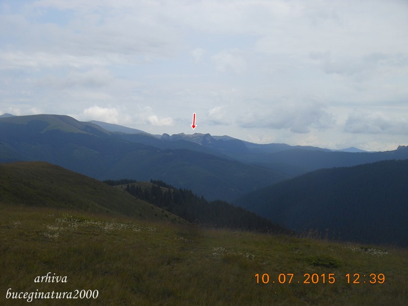 10.07.2015 053Iata si traseul nostru parcurs: in spate, departe, Bucegii… apoi sagetile arata creasta Leaotei, este de mers, nu gluma :) Cred ca in aceasta poza nu am cuprins nici o treime din intregul nostru traseu! Se vede in poza si o mica momaie din pietre cu marcajul banda albastra ce trece de Varful Leaota si apoi dispare undeva la o intersectie de drumuri de pamant.