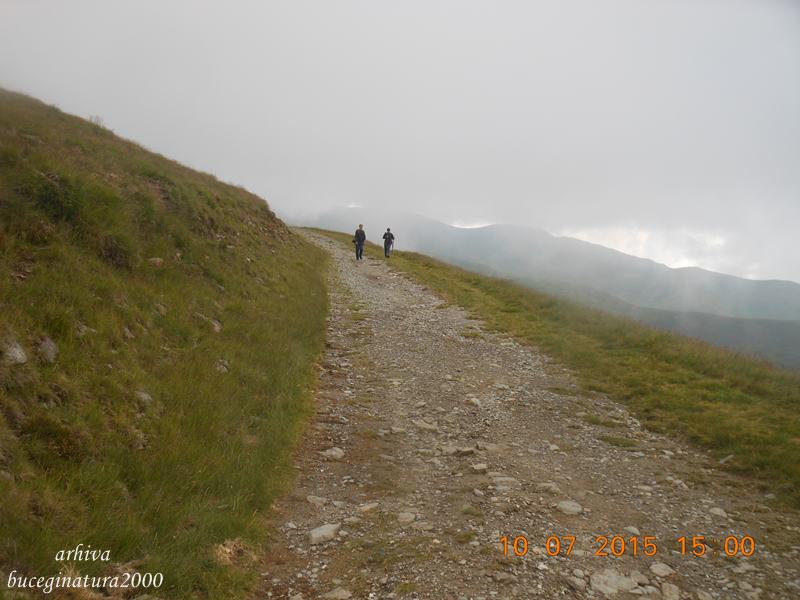 In creasta, ne-a intampinat un vant puternic si rece care ne-a determinat sa mergem mai repede, astfel ca am urcat culme dupa culme. Era si o poteca pe curba de nivel, aceasta ne-ar fi ferit de vant, dar prin iarba mare si plina de apa ne-am fi udat pana la genunchi. Apoi era si mai sigur de urmat creasta pe ceata.