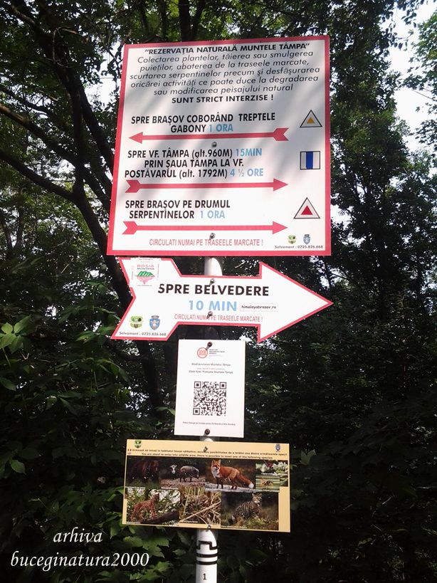 Buun! Si dupa ce am fost pe itinerariul Piata Prundului-Biserica Sf. Nicolae-Mormantul lui Nicolae Titulescu cu patrunzatorul sau testament-Pietrele lui Solomon, am zis sa urcam si pe Tampa. Cum m-am gandit eu ca nu are rost sa ne intoarcem pana in zona de unde suie „drumul serpentinelor”, am studiat putin culmile. Si mi s-a parut ca ar fi o poteca nemarcata prin padure, mi se parea logic ca aceia care locuiau pe langa padure sa aiba o carare spre Tampa. Asa, cu ochii dupa reperul natural stabilit, am intrat pe str. Curcanilor.