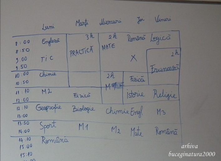 Nu, nu este un orar scris pe o pagina dintr-un caiet. Asa se scrie acum la tabla, adica la tabla se scrie cu un marker. Nu mai exista tabla de altadata si nu se mai scrie cu creta… viata curge, noi ramanem cu amintiri care nu peste mult timp vor parea niste ciudatenii…