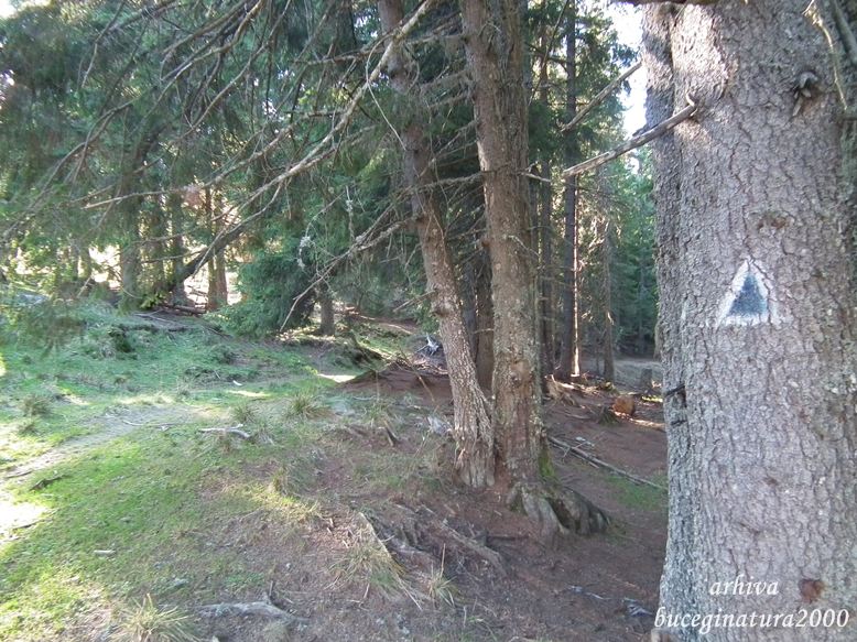Pentru cunoscatori si pentru cei care cauta acest traseu si tot nu-l gasesc. Nu ar fi rau sa-l remarcam intr-o zi. Marcajul triunghi albastru nu a fost unul oficial niciodata, in schimb traseul reprezenta in perioada anilor ’80 o provocare pentru tot felul de montaniarzi. Fata de cum era el descris in almanahurile turistice din perioada comunista, actualmente mai sunt ici-colo cate un marcaj. Multi au incercat sa faca traseul la pas cu GPS-ul, dar au pierdut traseul initial si fiecare a umblat in alta directie. Trebuie sa mergi de multe ori, dupa ani de zile… si total intamplator pui cap la cap tot traseul. Pentru ca mergi azi pe acolo si dorind sa scurtezi observi un marcaj, si mai pui pe harta o parte din traseul original. Maine cauti ciuperci si vezi alt marcaj, acolo unde nu te asteptai…