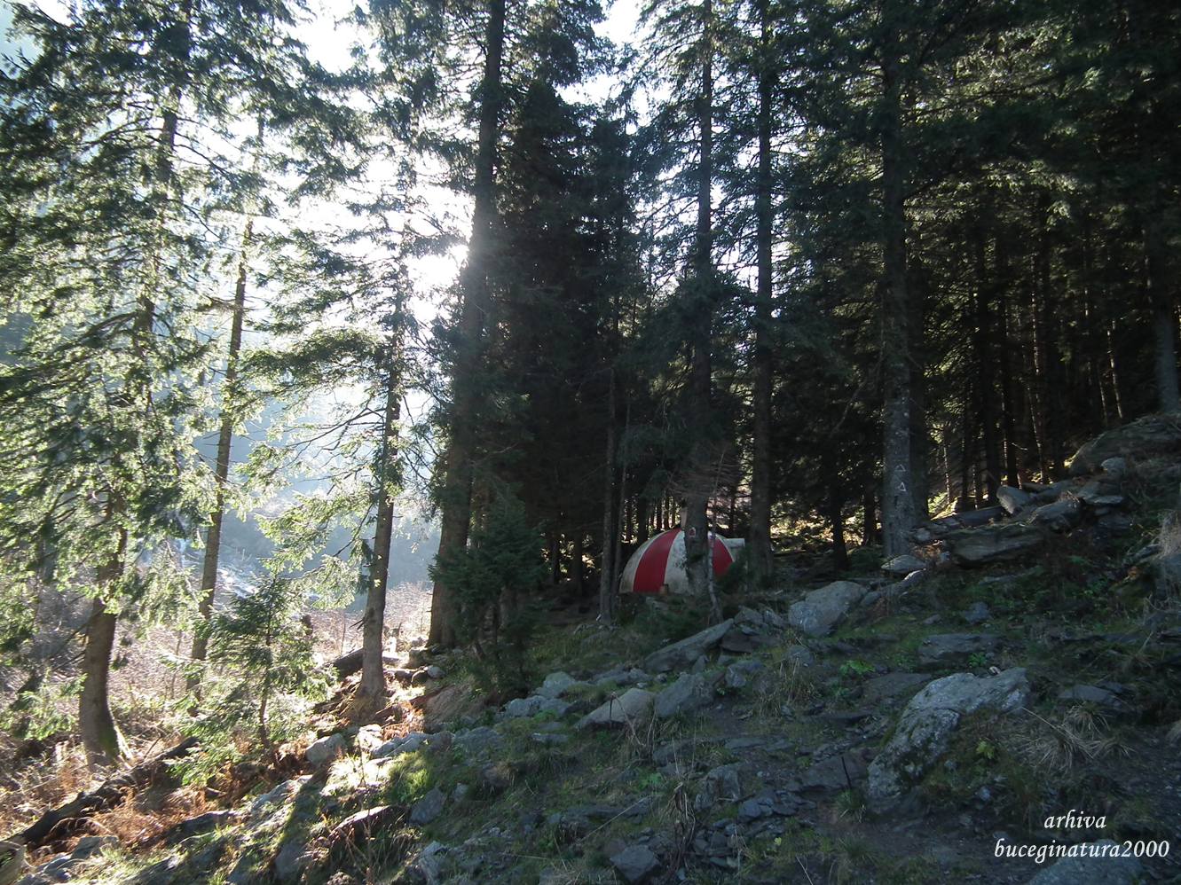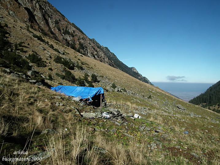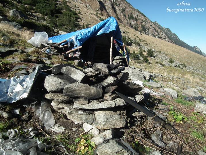 Un fel de bordei, pe la care am vazut ca nu trece ursul sau vreun animal. Erau urme de animale la vreo 300 metri, dar niciunul nu s-a apropiat de adapostul acesta… Concluzie desprinsa, pentru ca era mancare mai veche risipita pe jos, in fata intrarii si in interior.