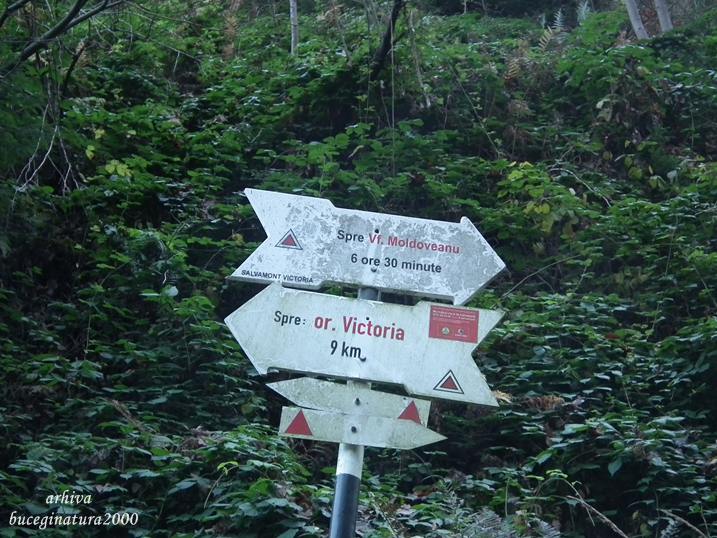 Pana la urma descoperim un reper si apoi marcaje mai dese. Ma gandeam asa: „sa vezi vale, sa vezi drum fara sfarsit”. Intalnim un indicator care ne linisteste… pana la Moldoveanu: 6 ore si jumatate :) Clar ca noi aveam sa facem 4 ore. Incepem sa mergem sustinut, intr-un ritm cam alert, dupa cum mi se pare mie, asa ca raman in urma, ocazie cu care mai fac si niste poze. Se termina forestierul chiar la indicatoarele din imaginea de mai sus, cred ca are vreo 4-5 kilometri si poteca urca pe langa parau, pe care il traverseaza de 3 ori pana la iesirea din padure. Evident, pe niste podete tare alunecoase.