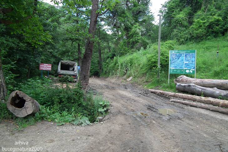 Aici, la ultimul panou. Mai departe vine un drum de pamant, mocirlos, degradat total de explotarile forestiere si de animalele satenilor. Daca nu ai tractor, buldozer, nu e vorba ca nu ajungi, problema este ca nu prea mai poti nici sa te intorci… :) Drumul este un dezastru.