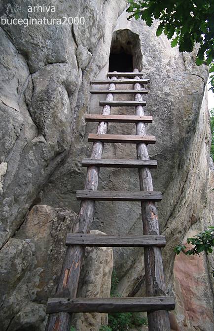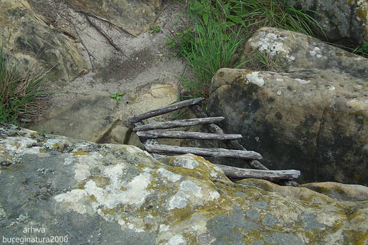 Urcam putin de la panou si facem stanga, apoi un alt urcus de 2 minute si vedem scara de acces catre chilie.