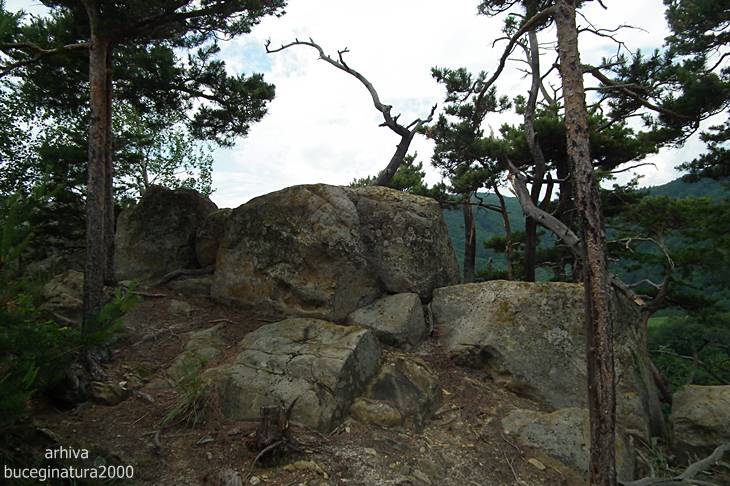Poteca urca prin poiana, trece de un crang de salcii batrane, urca un mic deal si ajungem tot in poiana dar pe un platou unde vedem doua stanci solitare. Facem dreapta inainte de ele, si vedem pe un copac triunghiul albastru. Cine nu este obisnuit cu muntele cat de cat, slabe sanse. Pe aici trebuiau niste stalpi metalici si o sageata metalica.
