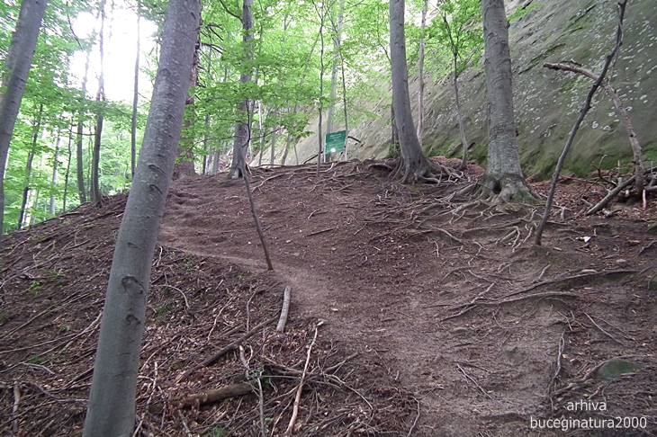 Prima sageata, cea de langa panou arata pe unde se urca la Chilia lui Dionisie, a doua, pe unde se urca la Fundul Pesterii si Scaunele lui Negru Voda. Revenim aproape de chilie, in traseul cu triunghi albastru.