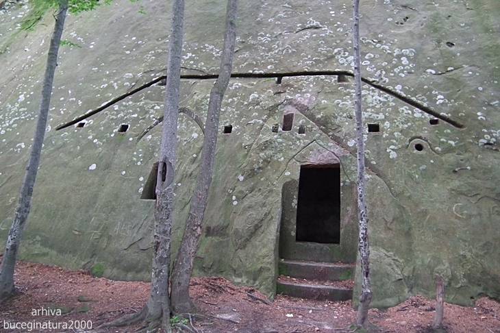 Dupa cum observati sunt niste nise sapate in perete. Acelea sustineau un acoperis ce se prelungea mai multi metri catre exterior, unde astazi sunt copaci, fagi. Celelalte gauri, patrate, sustineau grinzile din lemn ale acoperisului.